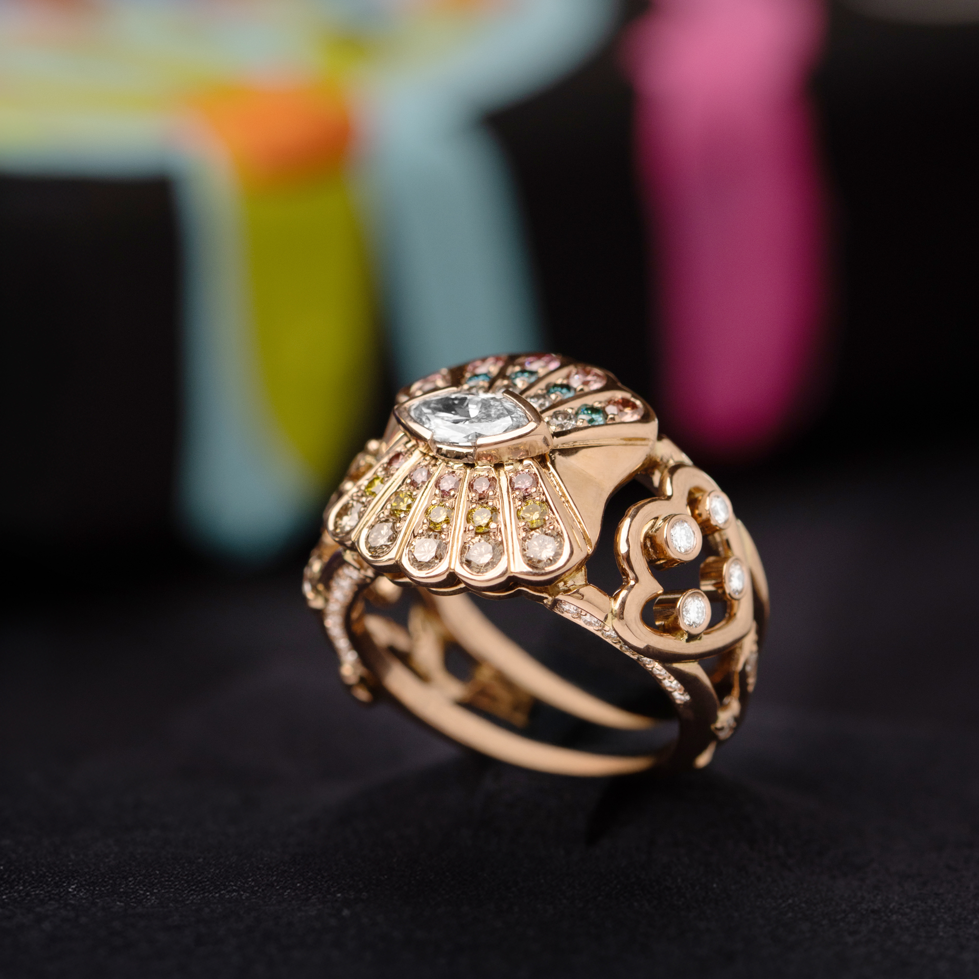 Pierres latérales serties de diamants blancs et de diamants fancy colorés (rose, champagne, bleu, jaune et gris).