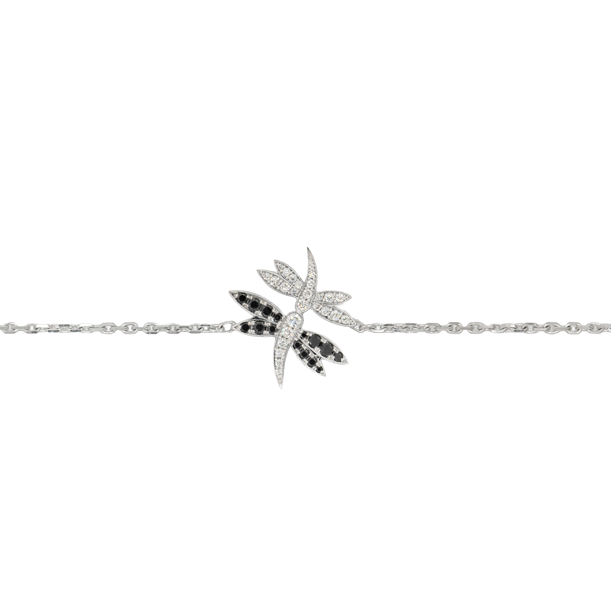 Libellule armband met 18k witgouden ketting en 18k witgouden middelgrote libellule bezet met pavé zwarte diamanten en witte diamanten.
