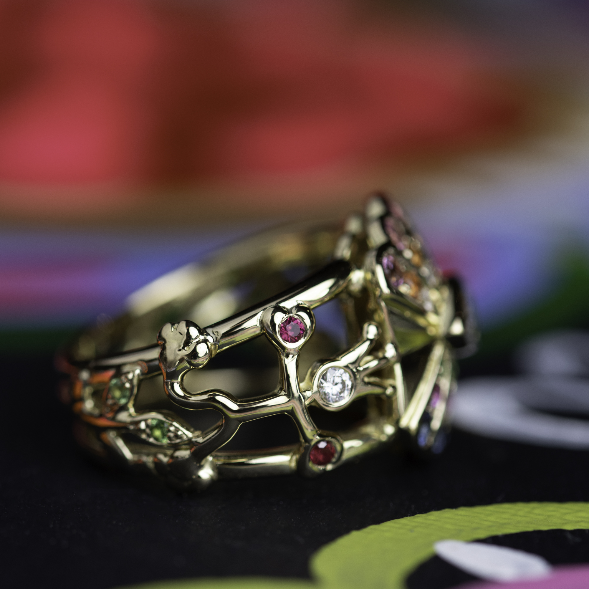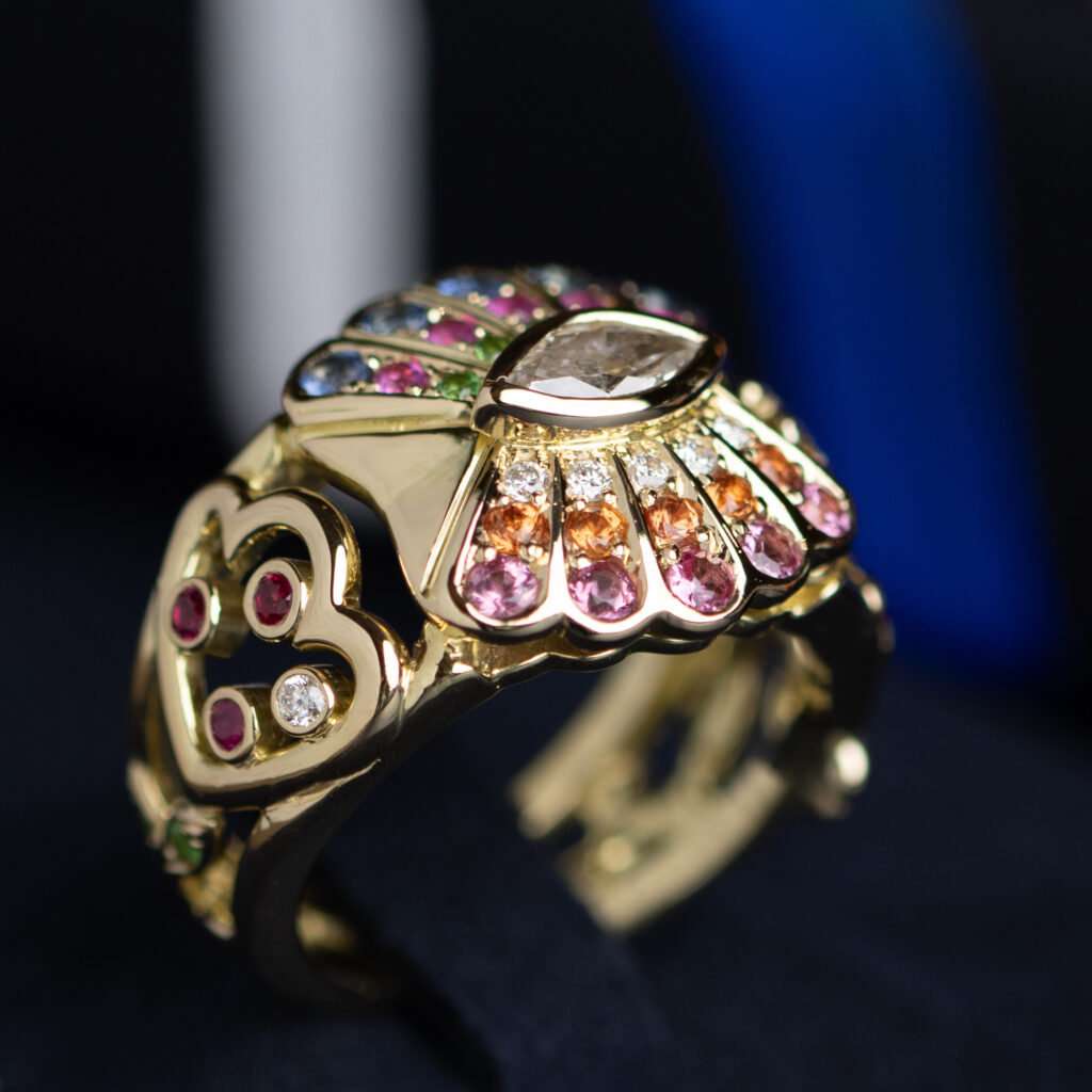 Side stones set with diamonds, fancy-coloured sapphires (pink, blue, and orange), rubies, and tsavorite.